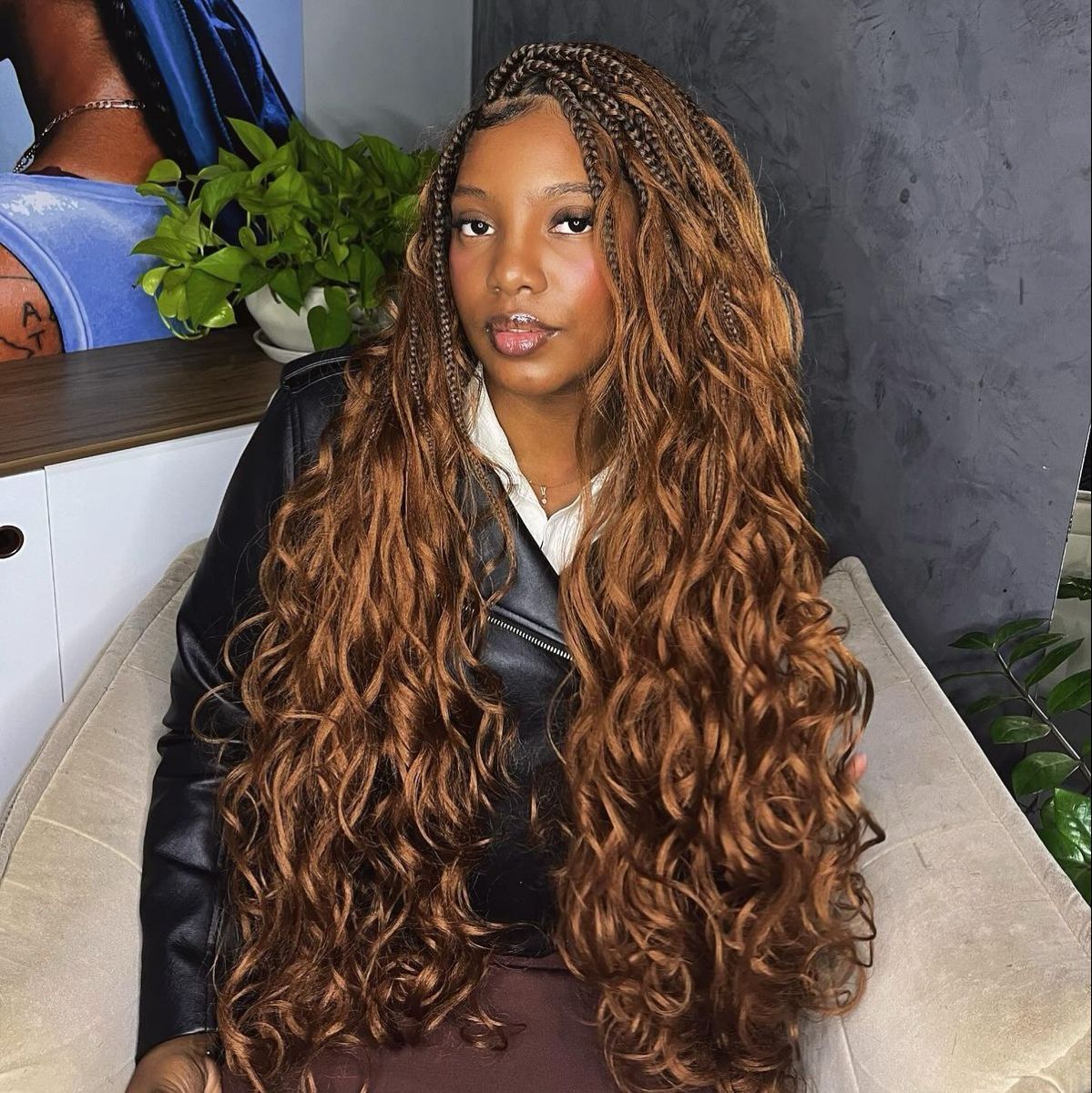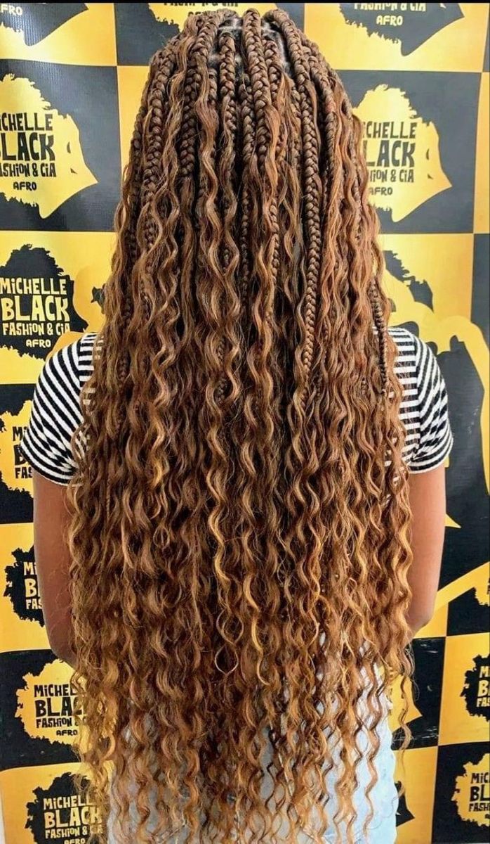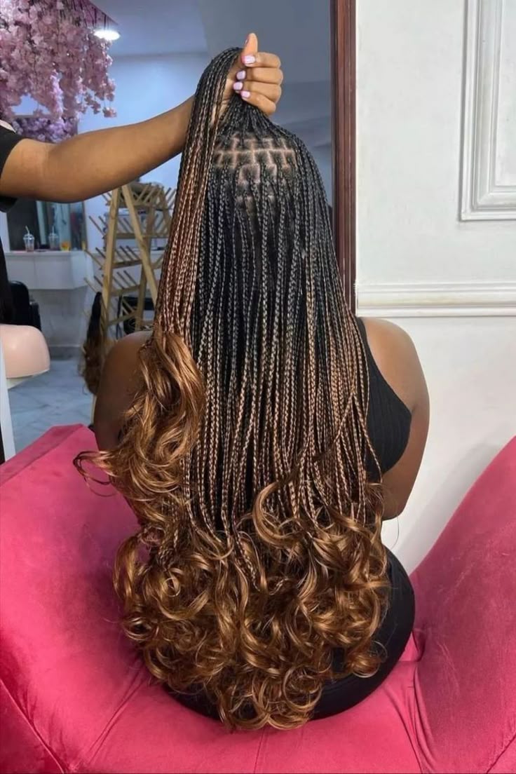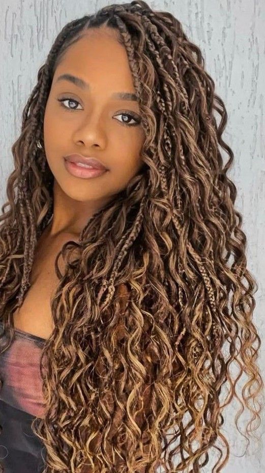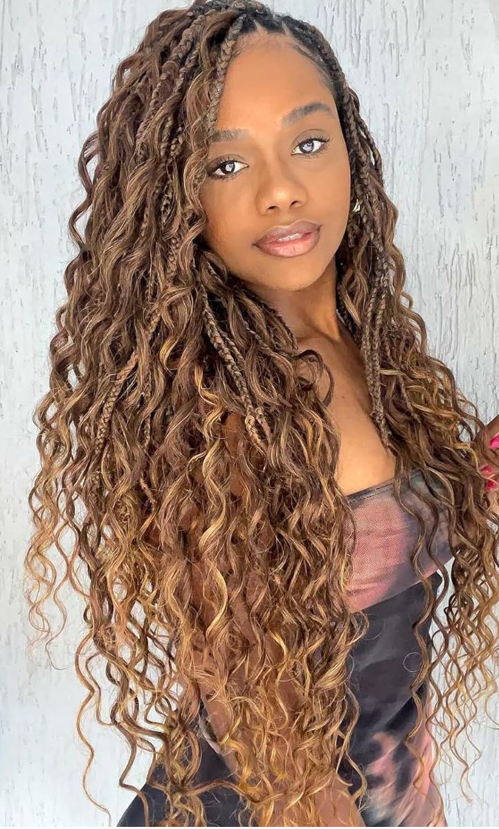 26. Mixed Brown Box Goddess Braids with Curled Ends