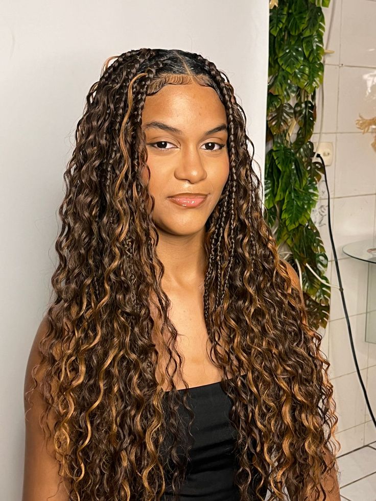 Long goddess braids in a deep brown base with soft honey highlights blended through the curls.