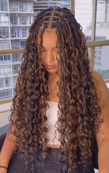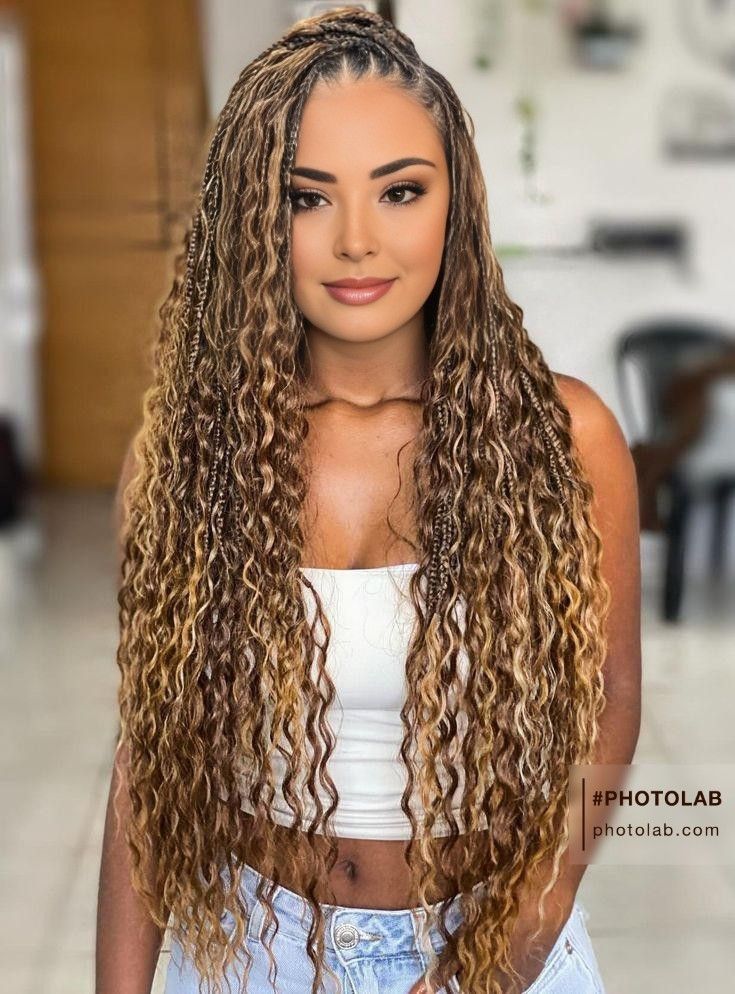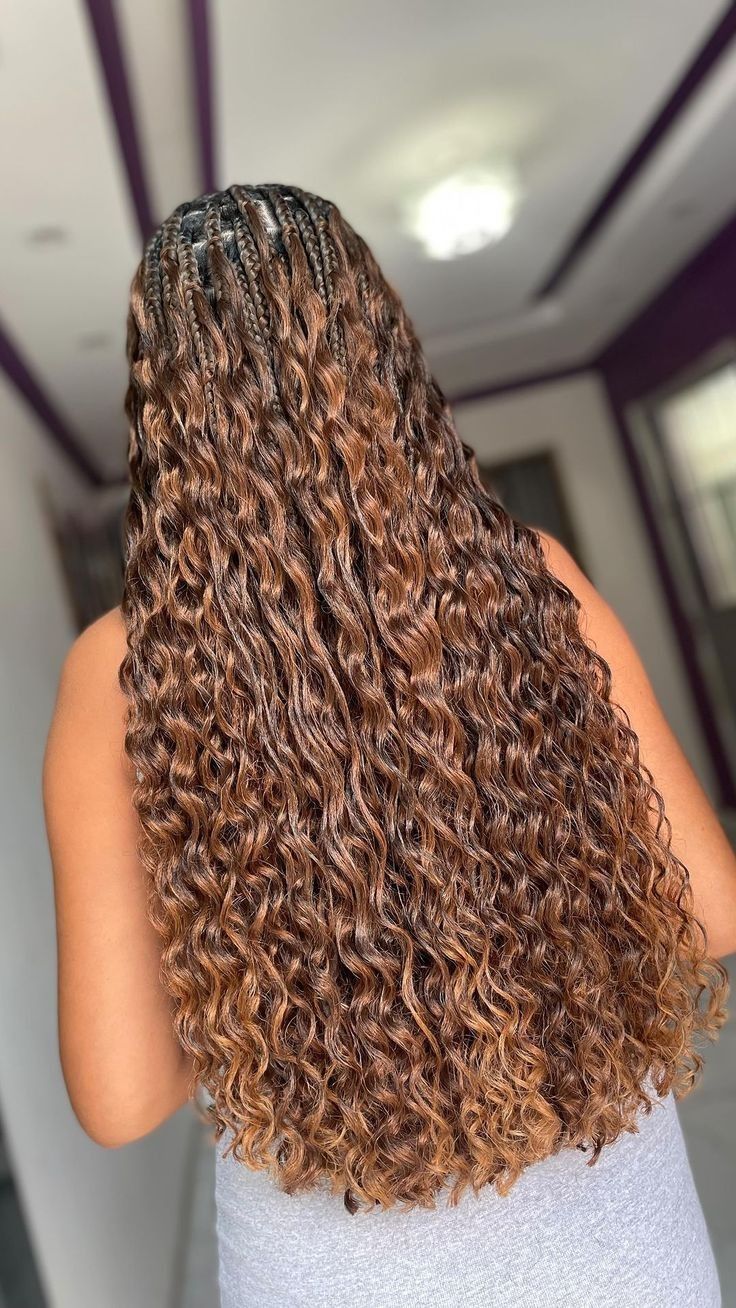 15. Honey Caramel Goddess Braids with Loose Defined Curls