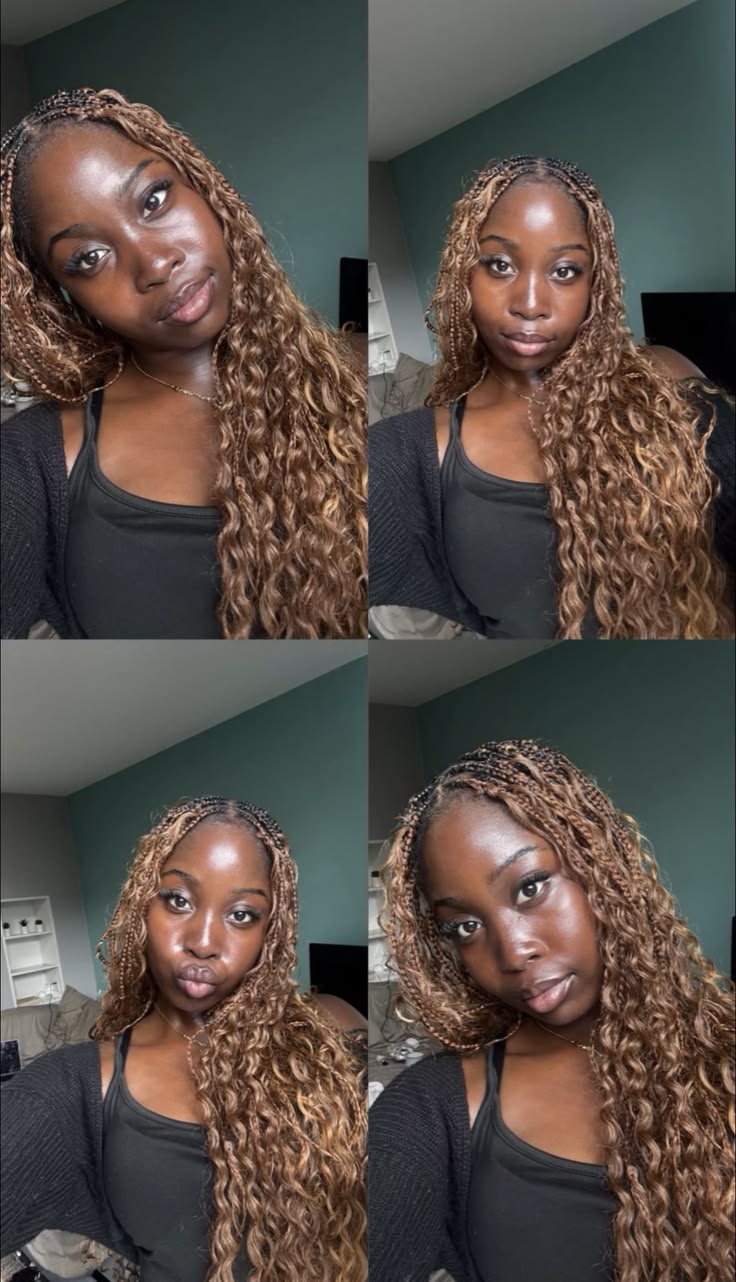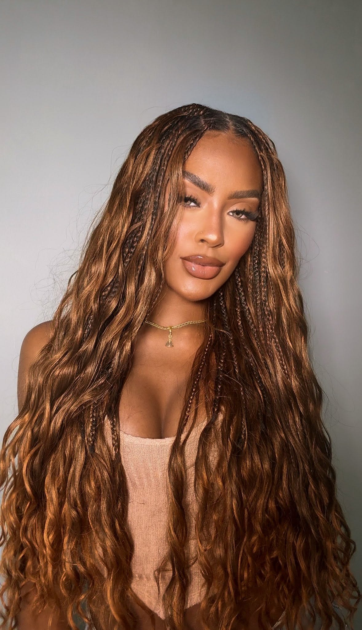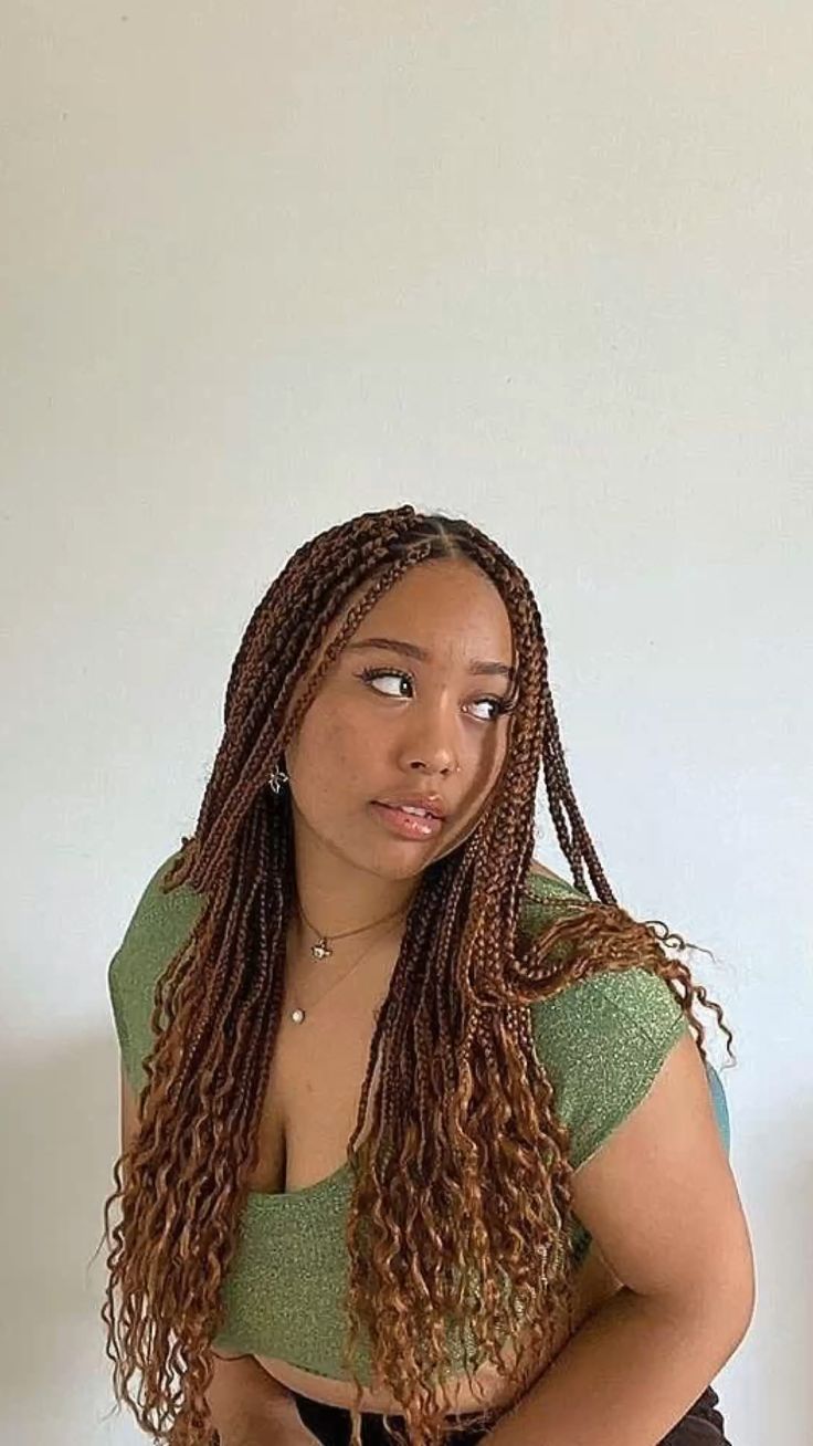 A lighter warm brown tone with small braids that transition into soft wavy ends, giving it that slightly undone look.