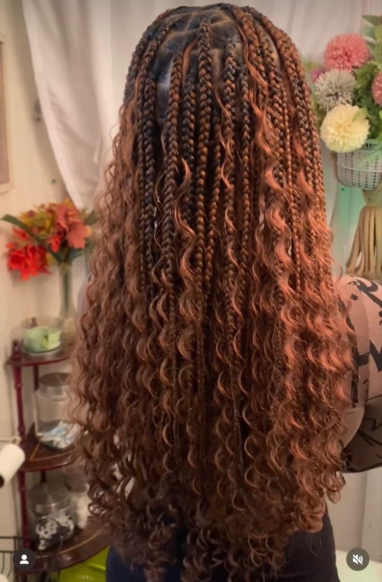 These braids have a mix of auburn and medium brown tones with more defined curls throughout the length.