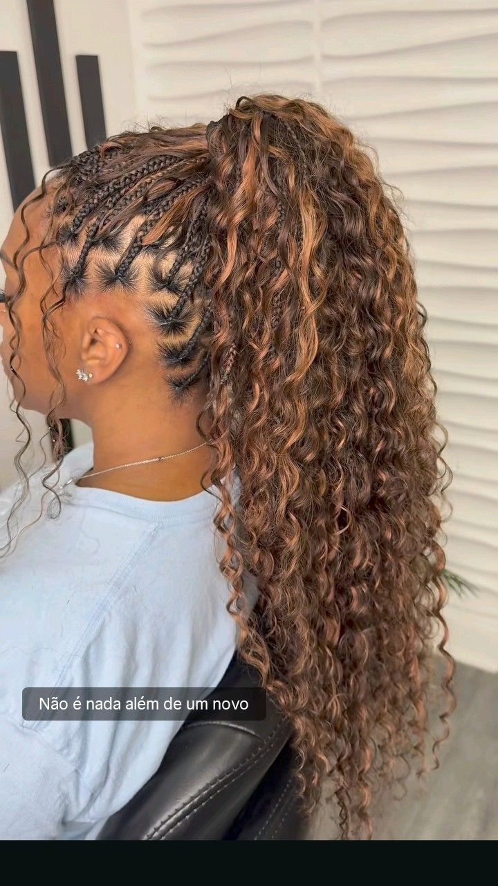 A darker espresso brown color with lots of tight, full curls mixed into the braids for a very voluminous finish.