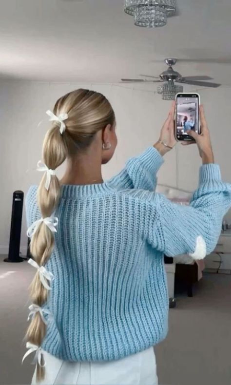 This bubble ponytail is adorable. The white bows make it look soft and girly and the length is so pretty.