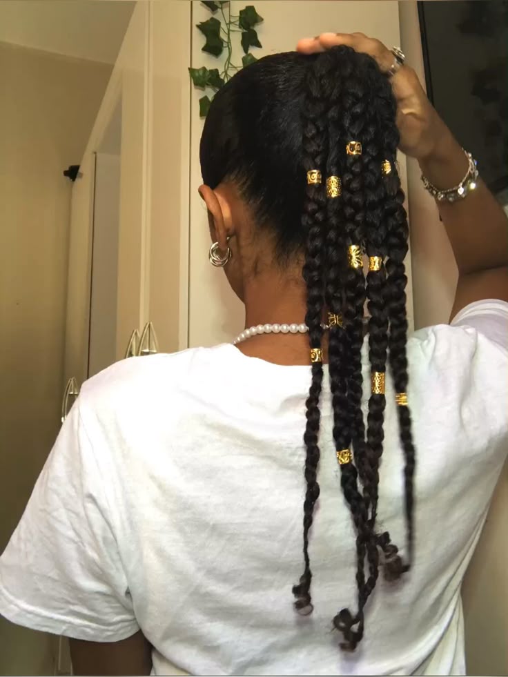 The top is smooth and neat and the braids falling down look strong and stylish. The gold cuffs add the cutest detail.
