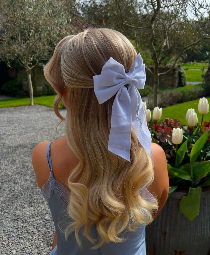 7. Half Up Blonde Waves With Blush Bow