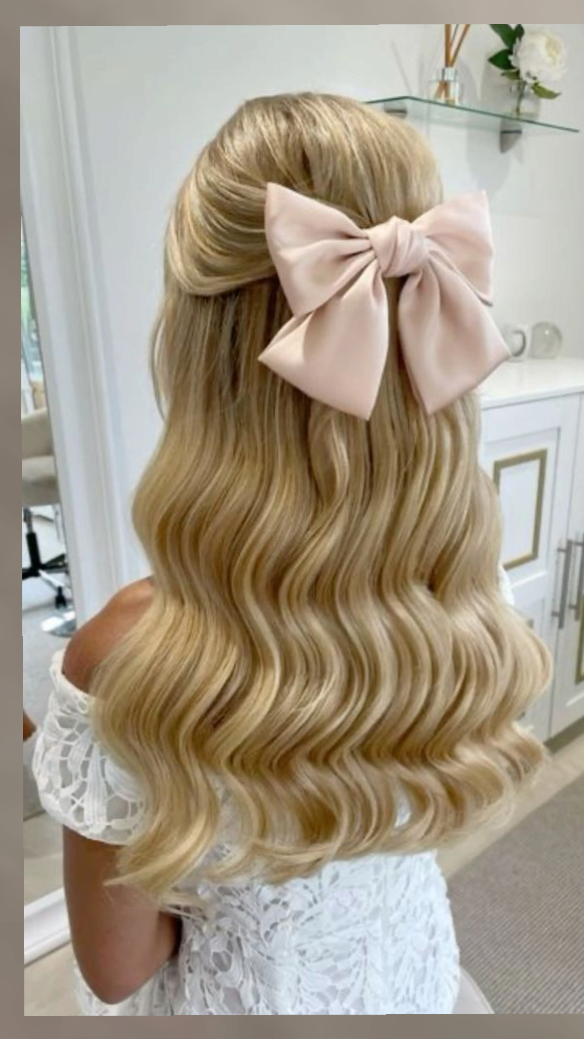 These waves are so soft and glossy. The blush bow adds the sweetest touch and makes the whole look feel gentle and feminine.