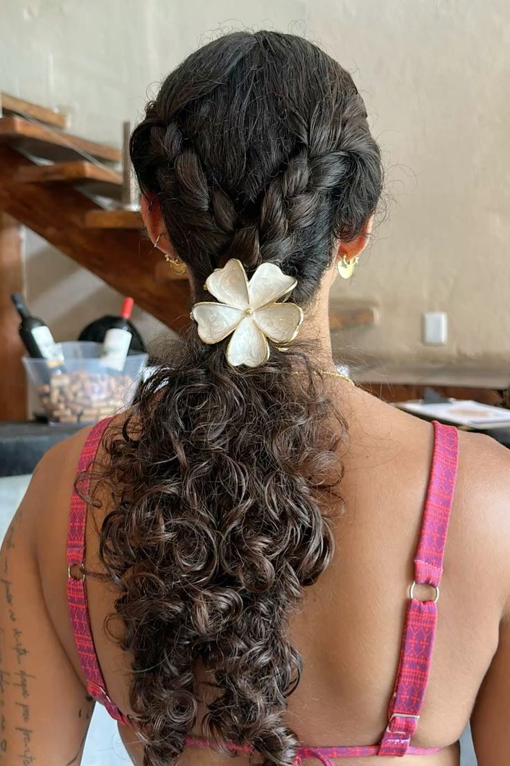 20. Low Curly Ponytail With Flower Clip
