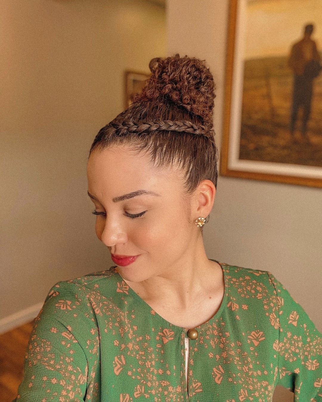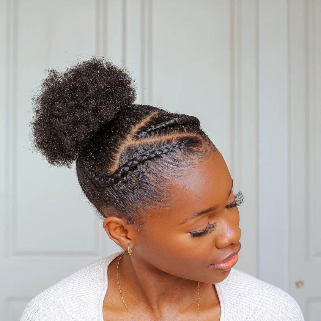 Hair is styled into a high puff. The front section has braided detail running diagonally across the scalp, adding dimension before gathering into the puff.
