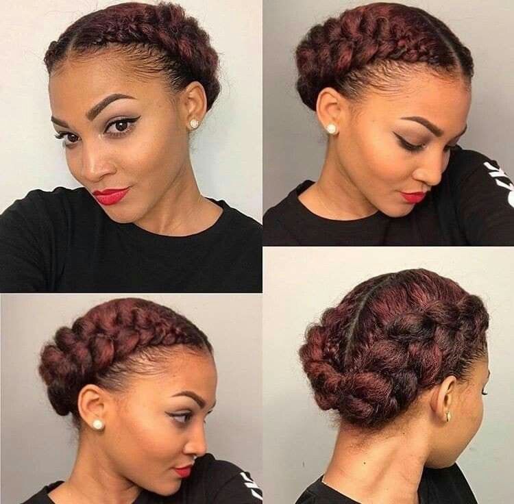 Hair is braided on both sides and wrapped into a low bun. The hair color has a deep burgundy tint, adding dimension. The braids are thick and defined, forming a structured updo.