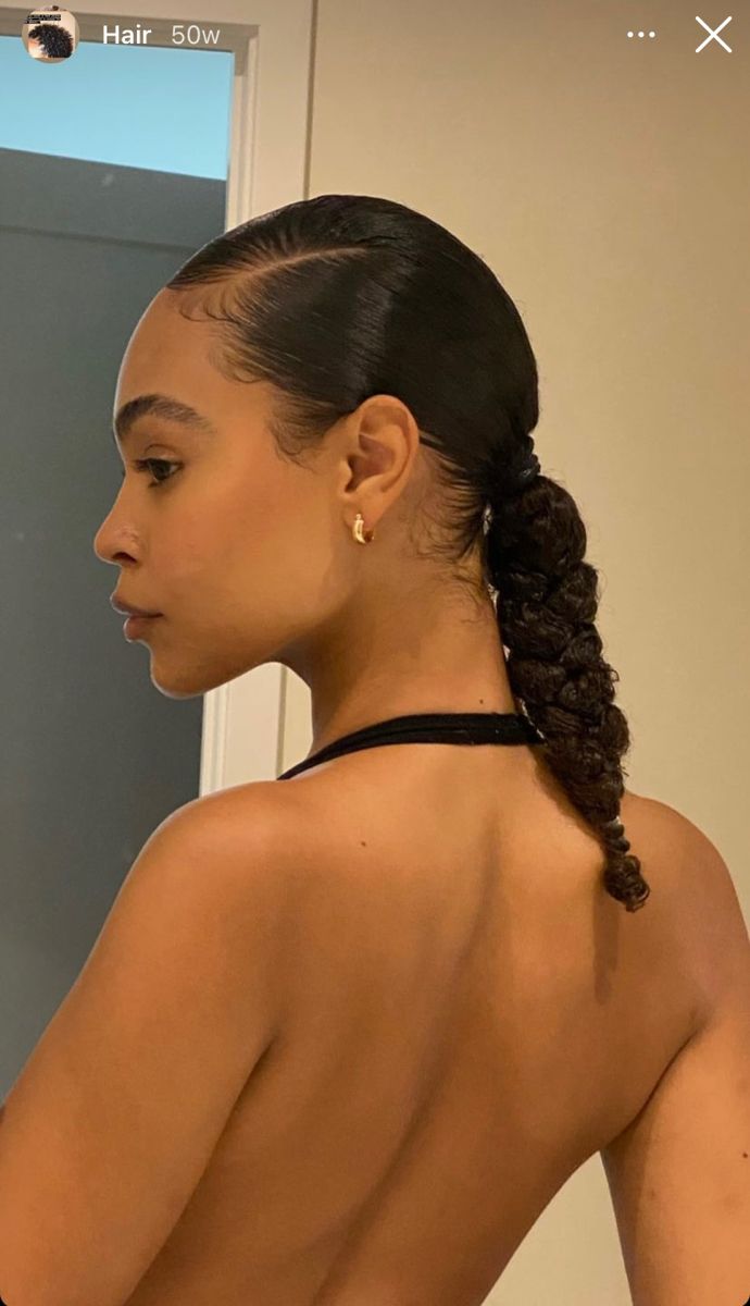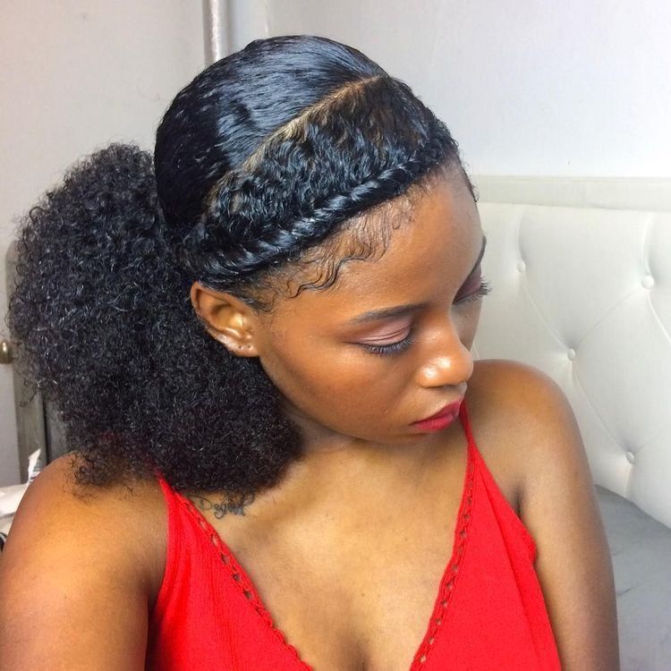 Hair is slicked back into a low ponytail with natural curls left out for volume. A single braid is styled across the front like a headband, blending into the ponytail. Edges are laid neatly.
