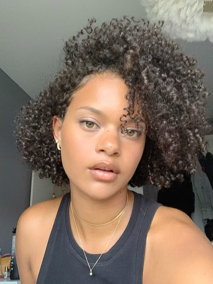 The gold cuffs make this pop. It’s a simple curly bob but the accessories elevate it. This really suits her skin tone too, everything just works. It feels modern and confident but still soft.