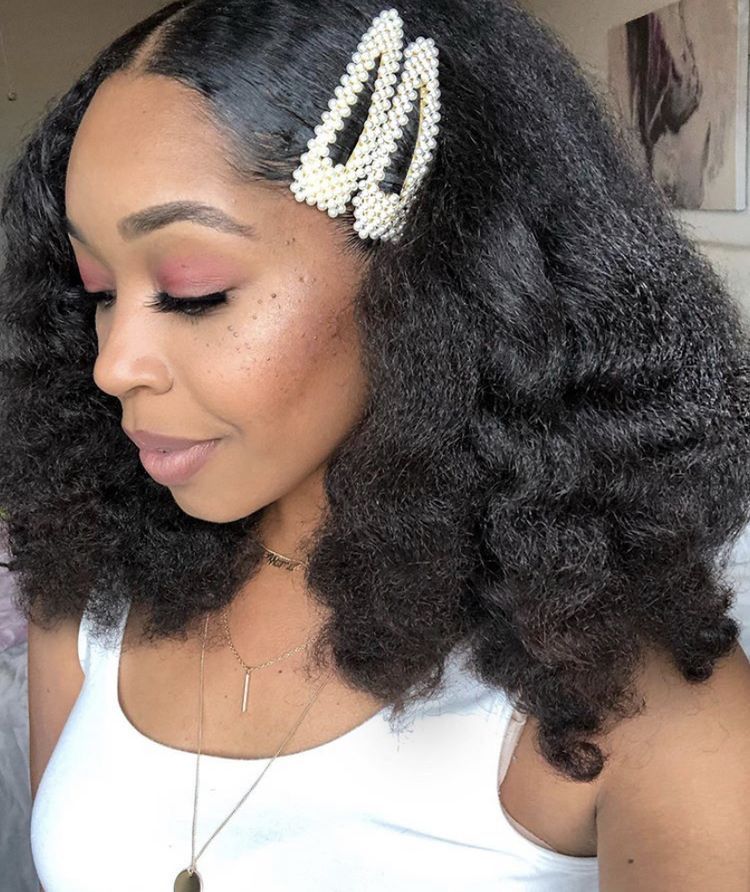 Hair is worn down in a full natural texture, styled with large pearl hair clips pinned on one side near the front. The texture is fluffy and slightly stretched.