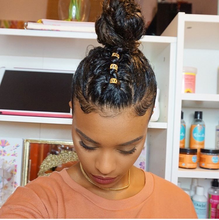 Hair is slicked into a high bun. A braided section runs up the center toward the bun and is decorated with small gold cuff accessories. The bun itself is full and neatly coiled.