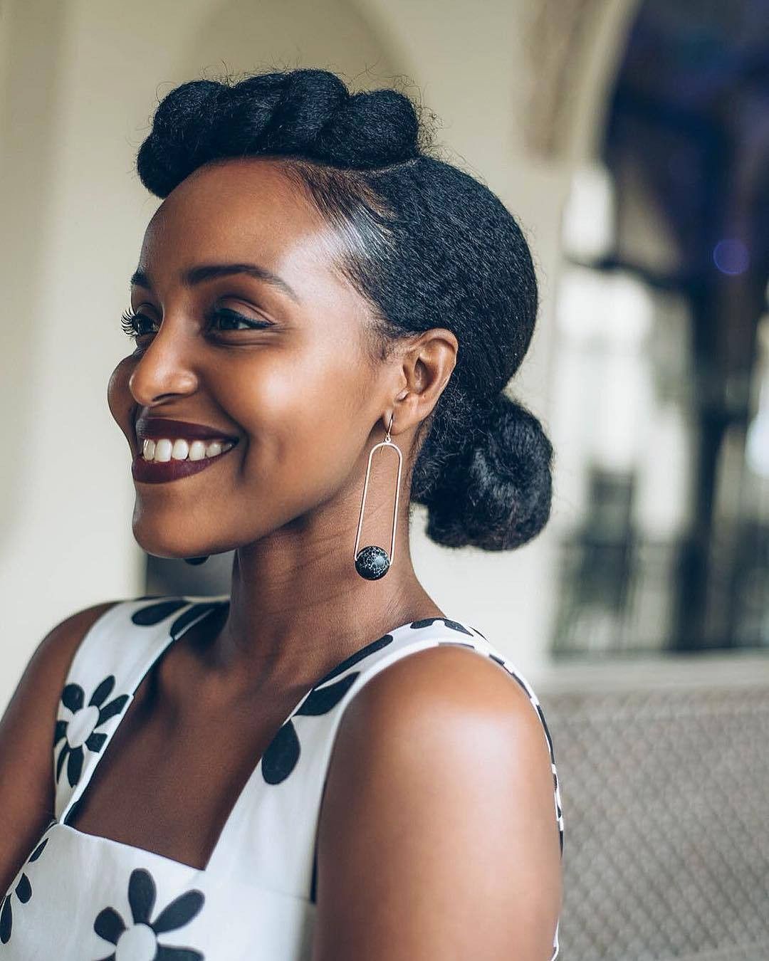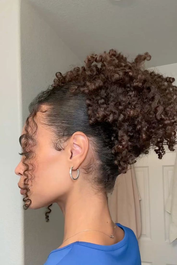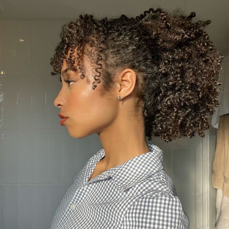Hair is gathered high into a puff with tightly defined natural curls. The sides are smoothed and edges are styled neatly, creating a clean contrast with the volume at the top.