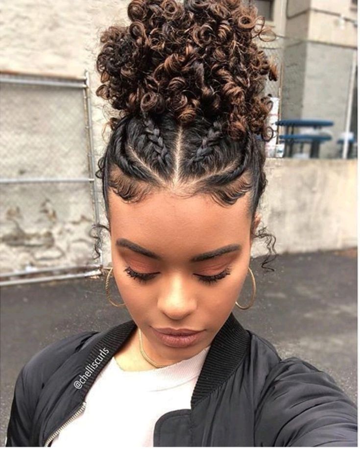 The front section is parted down the middle with small braids or cornrows leading into a high curly bun. The bun is voluminous and textured with tight curls.