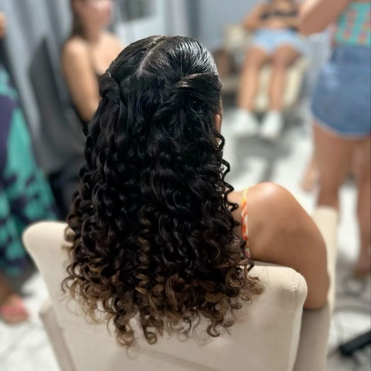 Hair is styled half-up with the top section pulled back smoothly while the rest of the curls fall down the back in defined spirals. The top is sleek with a subtle middle part.